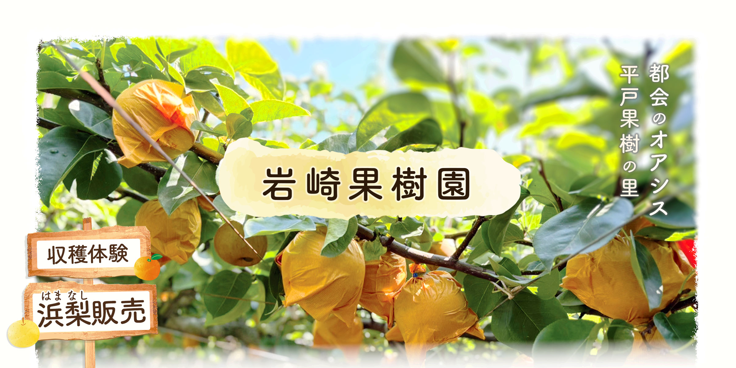 HOME iwasakikajuen いらっしゃいませ 岩崎果樹園へようこそ!横浜市戸塚区にある、小さな観光果樹園です。 平戸の街に「平戸果樹の里」として8件の農家が集まっており、岩崎果樹園はその中の一軒です。(⚠️岩崎農園さんとは営業日が異なりますのでご注意ください) それぞれの農園が少しずつ違った品目・品種・営業形態で季節のフルーツをお届けしています。 最新情報や休園日・料金については「最近の投稿」からご確認ください。(1つの果物に対して複数の投稿の場合もあります)